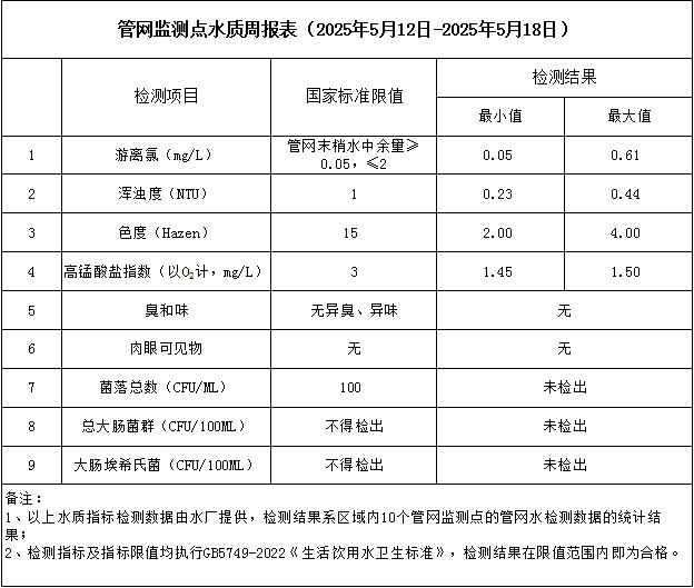 管網監測點水質周報表(2025年5月12日-2025年5月18日)