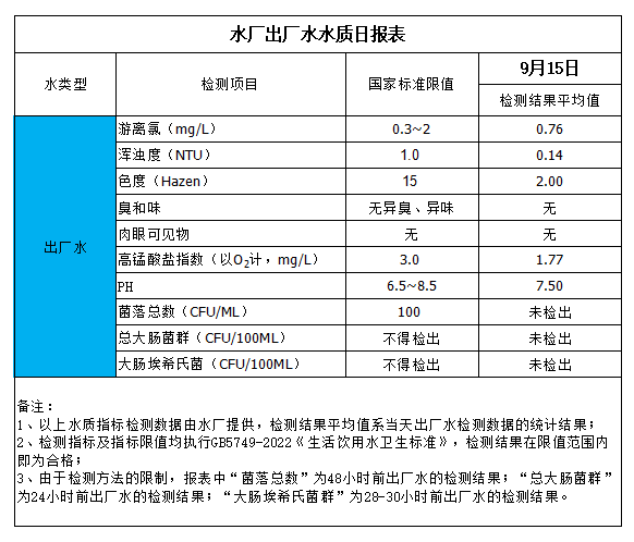 水廠出廠水水質(zhì)日報表(2023-9-15)